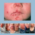 Impetigo is a bacterial skin infection common in children. It normally presents around the mouth area. Its very yellow, dry and crusty in nature. It is highly contagious too. Eczema can become infected, normally if the skin is broken and the person has scratched the skin. Impetigo is itchy just like eczema. The lower set of images is from an impetigo case that I solved.